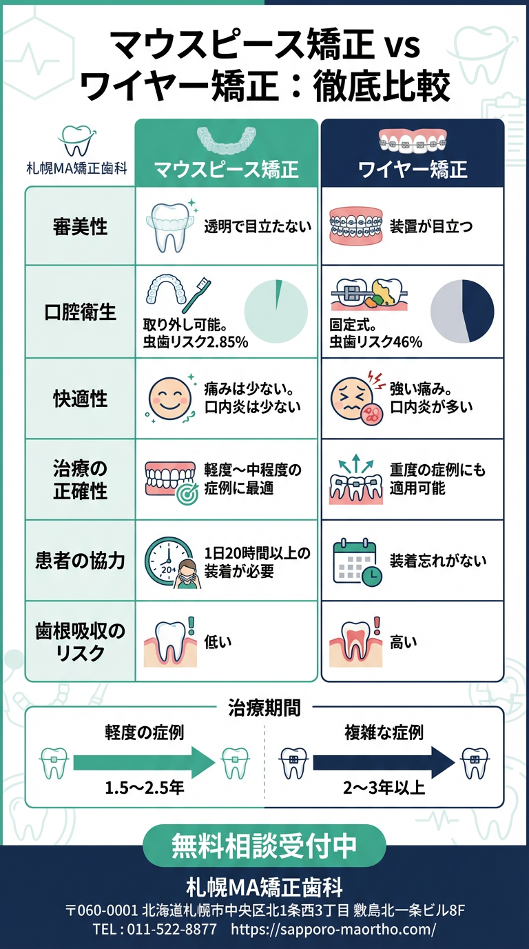 これらのデータからも、特に口腔衛生と歯の寿命に関わる長期的な健康リスクについては、マウスピース矯正が大きなアドバンテージを持っていることが分かります。
