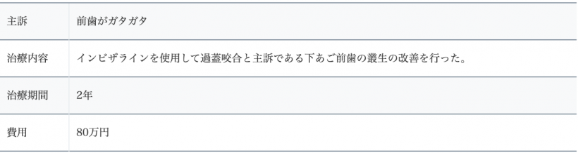症状は、上の前歯が下の前歯を隠しており、なおかつ上と下の歯列で中心線がずれてしまっていました。