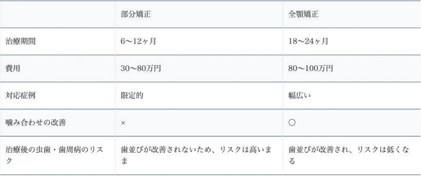 部分矯正と全顎矯正の違いを以下の表にまとめました。