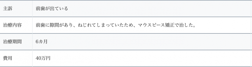 全顎矯正だと1年半~2年半ほど期間を必要としますが、前歯の矯正は半年~1年ほどと、短期間で改善することができます。