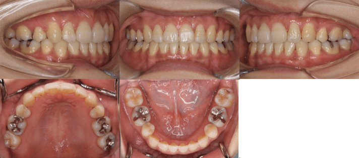 - 治療内容:小臼歯4本を抜歯した後、マウスピース型カスタムメイド矯正歯科装置(製品名インビザライン 完成物薬機法対象外)を使用して主訴である叢生の改善を行いました。